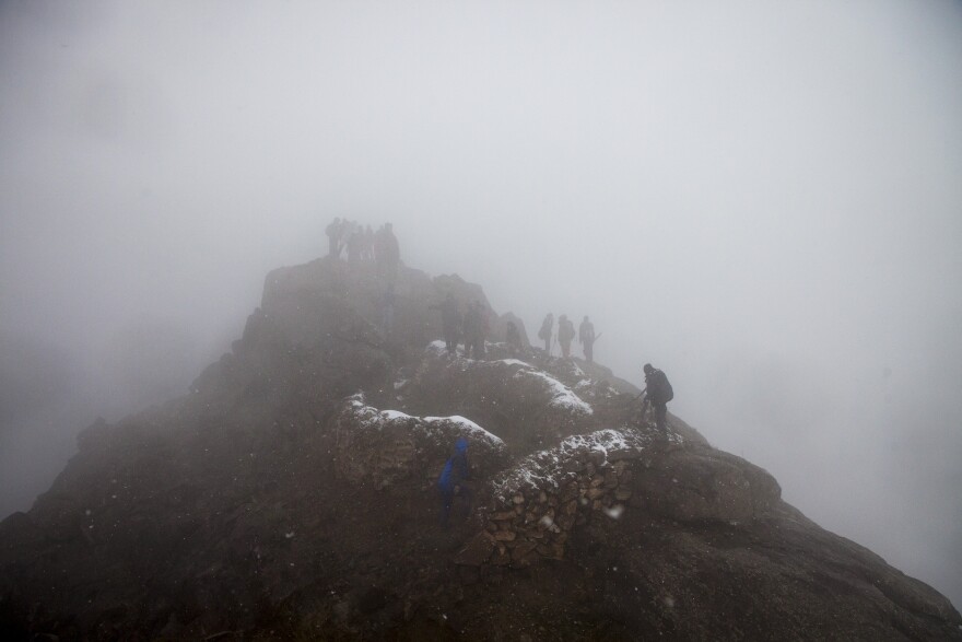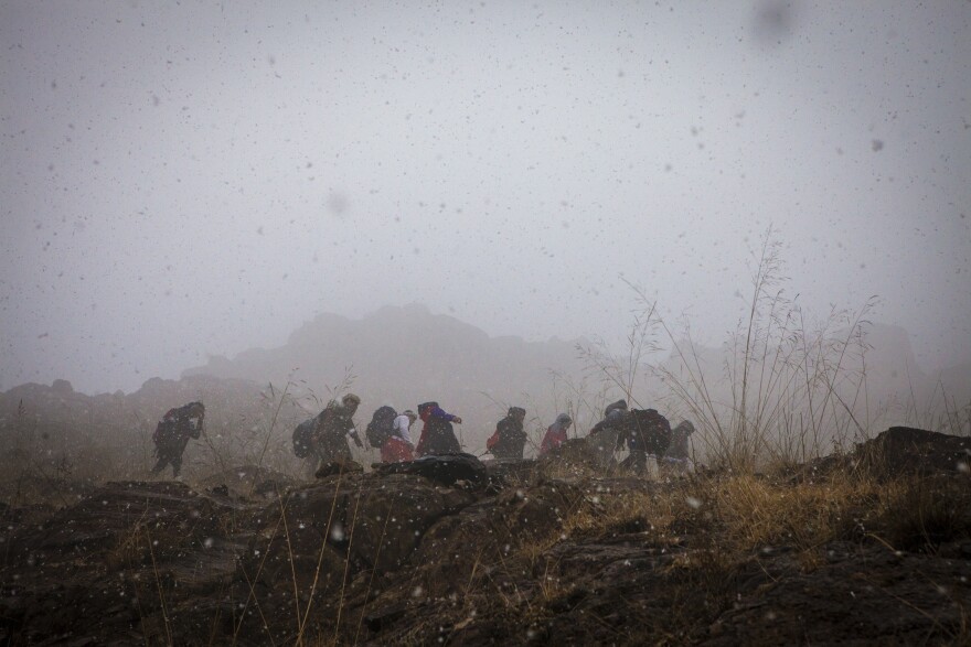 But shabby shoes and falling snow don't stop the girls. They take less than two hours to hike up the trail-less slopes. Once on top, they pose for selfies and dine on kebabs — rappelling is out because of the bad weather.