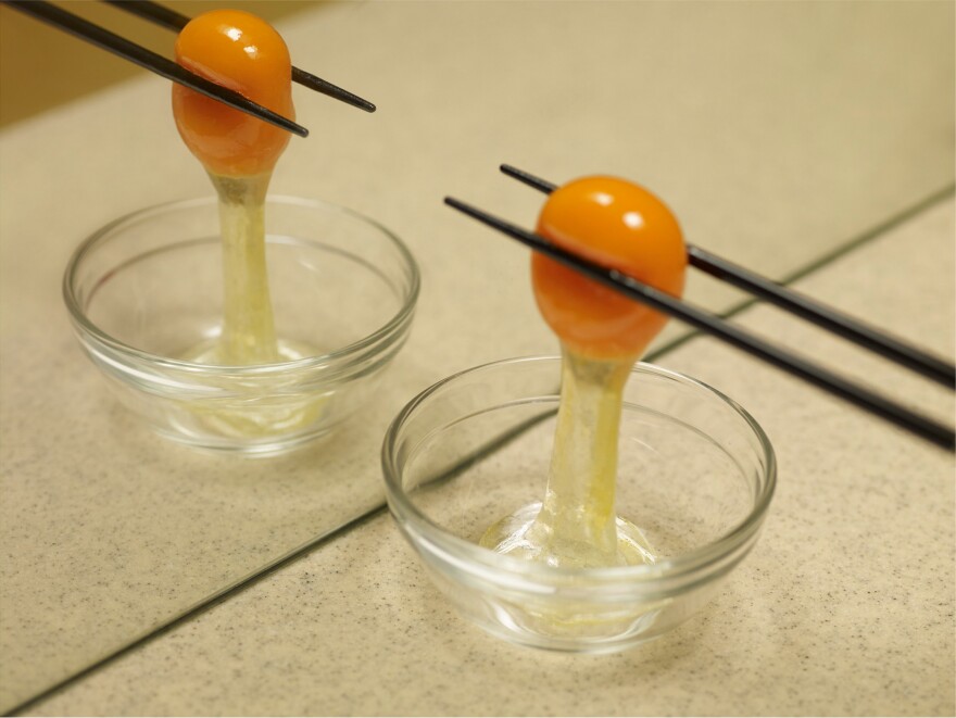 Upon first glance, I assumed this image was set up for the shoot — with someone delicately gripping an egg yolk in between chopsticks. Come to find out, "this piece was not custom made for the shoot. The piece actually exists as a display food," Schoerner told me. It's all one plastic piece.