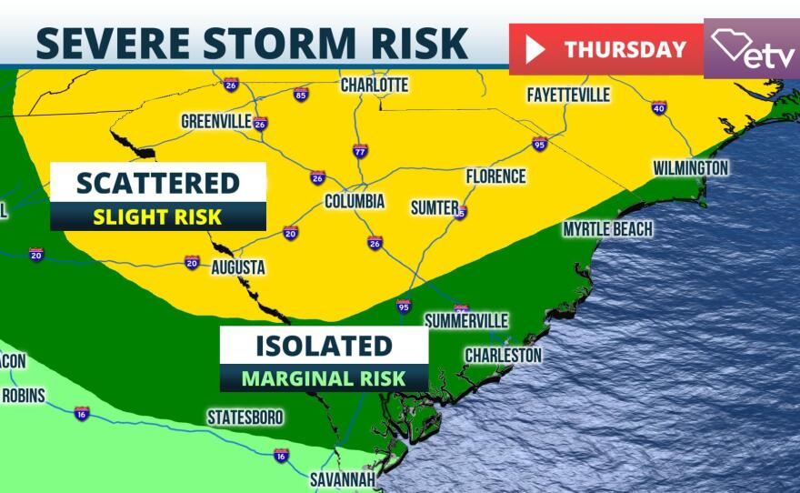As of Tuesday morning, model guidance suggests that the greatest threat for these storms will occur on Wednesday, especially over the northern third of the state, and Thursday. On both Wednesday and Thursday, meteorologists have classified parts of South Carolina under a slight risk, or level two out of five, for severe thunderstorms.