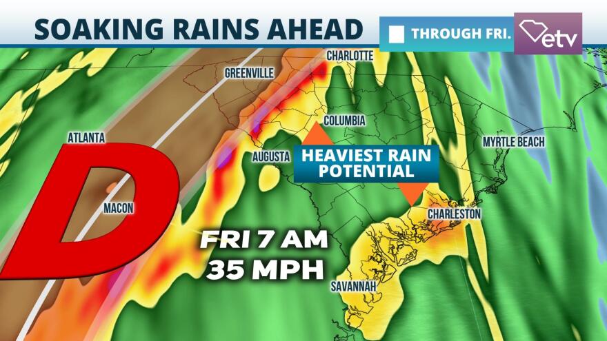 Tropical storm warnings are in effect for portions of the Lowcountry, including cities like Charleston and Beaufort. Storm surge warnings stretch from the mouth of the South Santee River to the South Carolina-Georgia border, while coastal flood advisories stretch along the Grand Strand. A wind advisory is in place for much of the state west of I-95 in lieu of tropical storm watches or warnings. Gusts in the wind advisory area could reach 40 miles per hour Thursday night through much of Friday.