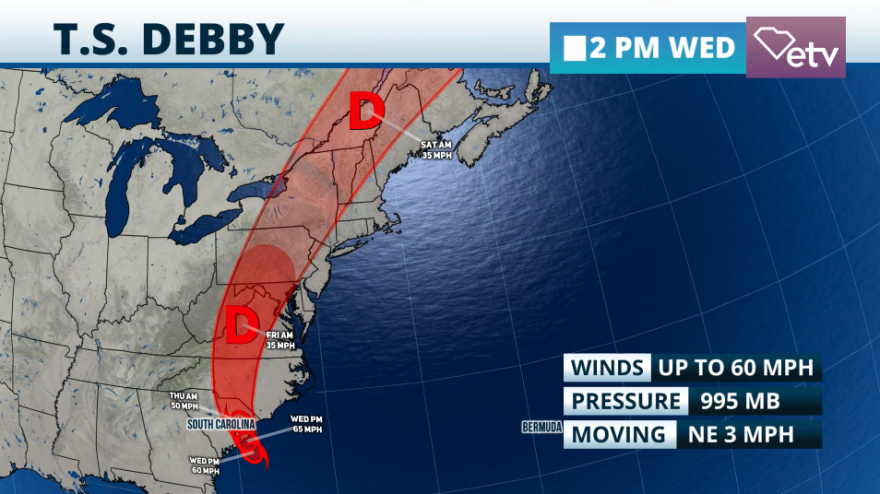 Also, Debby will continue to gain a little bit of strength and it may reach 70 mph before making landfall Thursday morning. After Debby makes landfall expect the maximum sustained winds to gradually weaken as it moves inland. Although Debby is moving slowly this Wednesday once it makes the turn toward South Carolina and moves inland. Its forward speed is expected to increase, and the system will be traveling over the Mid-Atlantic and through the Northeast throughout the rest of the week.