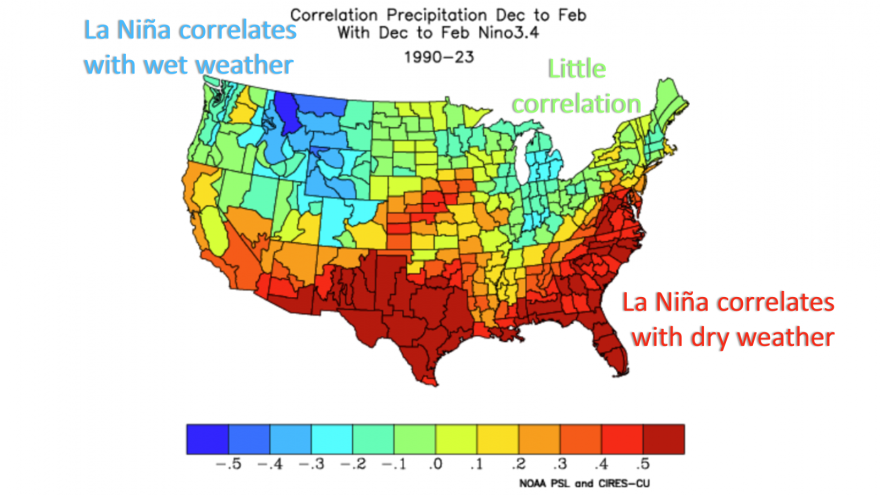The reason for this prediction is due to La Niña conditions that are currently present and predicted to persist through April 2025. La Niña would mean a warmer and drier winter for South Carolina. La Niña pushes storms into the Pacific Northwest on a more northerly and inland track, holding the jet stream at higher latitudes longer where it traps cold air to its north. This typically means dry weather, warmer conditions and drought for the southern U.S. and cooler temperatures for the Upper Midwest and Pacific Northwest.