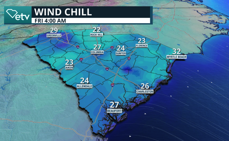 Keep in mind that these temperatures will feel colder due to strong winds, primarily from the north. Gust could be as high as 25 mph, especially across the Midlands and the coast. On Friday, the wind will remain strong, with the strongest winds focused mainly across the Upstate, Columbia, and the Lowcountry. Gusts could be as high as 30 mph at times. As for Friday, we will wake up to cold temperatures across the Upstate. Temperatures will be around the low to mid-20s. The Midlands will remain in the upper 20s. The Pee Dee will wake up the temperatures in the upper 20s, and the Lowcountry will be around the freezing mark.