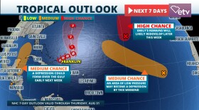 The National Hurricane Center is now marking a spot from the northwest Caribbean into the eastern Gulf of Mexico with a moderate chance for development. Tropical Storm Franklin is now becoming better organized and will likely become a hurricane over the weekend.