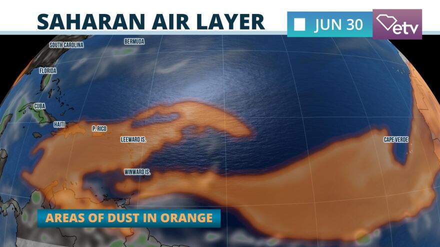 A phenomenon known as the “SAL” (Saharan Air Layer) is dust that forms on the African continent that is lofted into the middle parts of the atmosphere and is pushed westward across the Atlantic Ocean. According to NOAA, “the SAL can have a significant negative impact on tropical cyclone intensity and formation.”