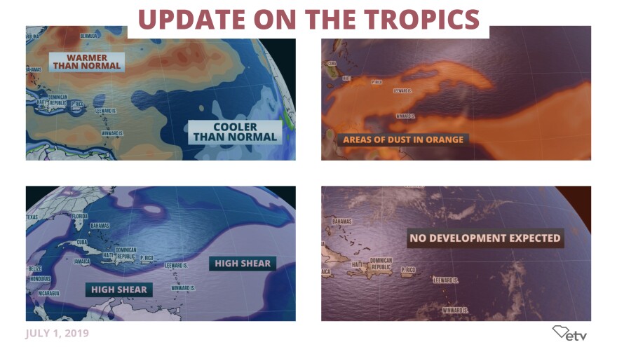 Water temperatures might be favorable for tropical development in some areas, but other conditions such as wind shear and dry, dusty air are likely to prevent tropical storms or hurricanes from developing during the first two weeks of July. In this “State of the Season” update, we will provide an overview of those conditions and trends we are watching that could influence the long range forecast in the tropics.