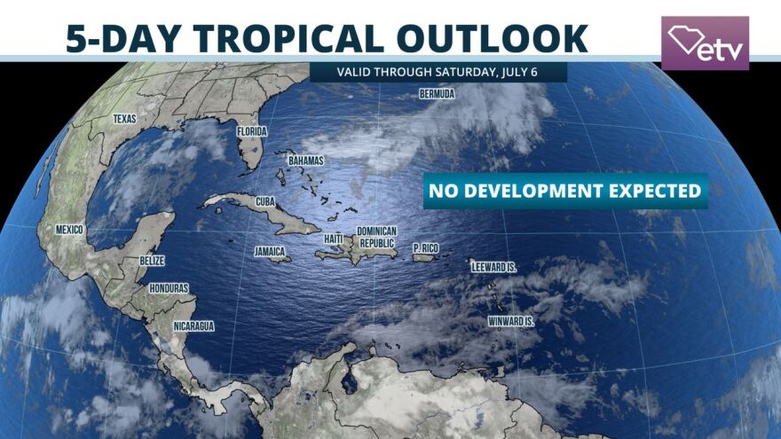Forecasters at the National Hurricane Center do not expect tropical storm formation over the next five days, and NOAA's global outlook indicates no tropical cyclone formation is likely over the next two weeks.
