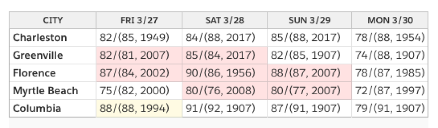 The table below lists the forecast high temperatures compared to the records of each day for select cities across South Carolina. A yellow background denotes the possibility of a record being tied, whereas a light red background represents a likely scenario where a record high will be broken.