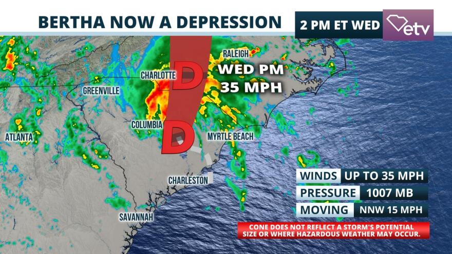 As of 2PM EDT Wednesday afternoon Bertha was located about 70 miles north-northwest of Charleston and continues to move inland at about 15 mph, delivering heavy showers to the Midlands, Pee Dee and Lowcountry regions.
