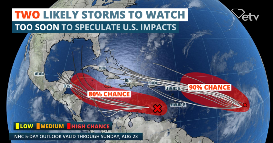 Two tropical depressions or storms are likely to form in the tropical Atlantic basin within the next two days, but it's too soon to make a credible forecast on whether they will impact the United States.