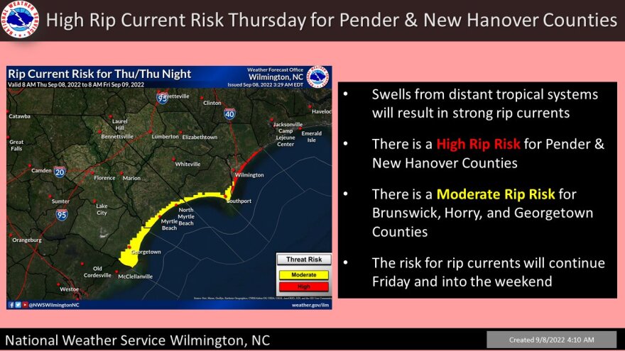 Category 2 Hurricane Earl is still forecasted to move northeast and stay well off the east coast, however powerful swells will cause a moderate to high risk of rip currents at many area beaches. The highest risk will be near the NC border with a moderate risk along the upper coast from North Myrtle Beach down to Georgetown. The lower coast will have a lower threat. If you decide to hit the South Carolina shores, consider staying in knee deep water or less until the threat decreases on Sunday. The Wilmington NWS also warns of rough surf and minor coastal flooding from Earl’s impacts.